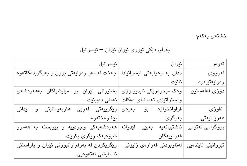 ململانێی ئێران – ئیسرائیل، زیاترە لەوەی تەنها ناکۆکییەکی سیاسی بێت، چونکە ململانێیە لەنێوان دوو تێڕوانینی ستراتیژی بۆ ناوچەکە: یەکەمیان ئیسرائیل دەبینێتەوە وەک ناوەندێک بۆ پارێزگاریکردن لە هاوسەنگییەکانی هێزی خۆرئاوایی و دووەمیان ئێران دەبینێتەوە وەک سەرکردەی بەرەی بەرگری، کە هەوڵی گۆڕینی ئەم سستمە دەدات و لەگەڵ قووڵبوونەوەی پشێوییە هەرێمایەتییەکان و غیابی چارەسەری سیاسی گشتگیر، ئەم ململانێیە وەک دیارترین هەڕەشەکانی ئاسایشی هەرێمایەتی و نێودەوڵەتی دەمێنێتەوە.