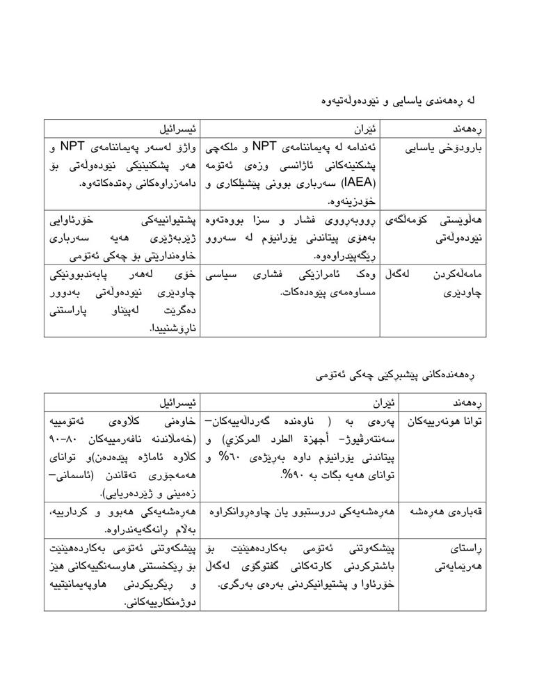 ئەمریکا: پشتیوانی لەپێشکەوتنی ئیسرائیل و ڕێگری لە خاوەندارێتی ئێران دەکات بۆ چەکی ئەتۆمی لەگەڵ دابەشبوونی لە چۆنییەتی مامەڵەکردن (ڕێککەوتننامەی ئەتۆمی بەرامبەر فشارە ئابووری/ سەربازییەکان).