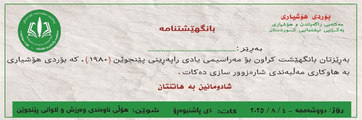 بۆردى هۆشیارى- مەکتەبی راگەیاندن و هۆشیارى، بەهاوکارى مەڵبەندى شارەزوور، لەیادى یەکەمین خۆپیشاندانى شارەکانى کوردستان لەپاش هەرەسى جوڵانەوەى ئەیلول لەلایەن خەڵکى سەربەرزى پێنجوێن لەتەمموزى ساڵى ١٩٨٠ مەراسیمێک سازدەکات.
