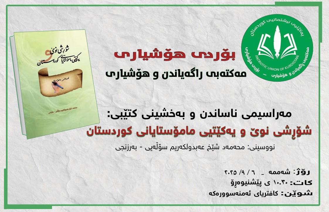 بۆردى هۆشیارى- مەکتەبی راگەیاندن و هۆشیارى، پێشنیوەڕۆى رۆژى شەممە(6/9/2025) کاتژمێر(10:30) لەکافتریاى مۆزەخانەى نیشتمانى ئەمنە سوورەکە مەراسیمى ناساندن و بەخشینى کتێبى(شۆڕشى نوێ و یەکێتى مامۆستایانى کوردستان) لەنووسینى(محەمەد شێخ عەبدولکەریم سۆڵەیی- بەرزنجى) ساز دەکات. بەشداریکردنتان لەم مەراسیمەدا رێزگرتنە لەگیانى شەهیدان و رەنج و ماندوونى مامۆستایان تێکۆشەر..